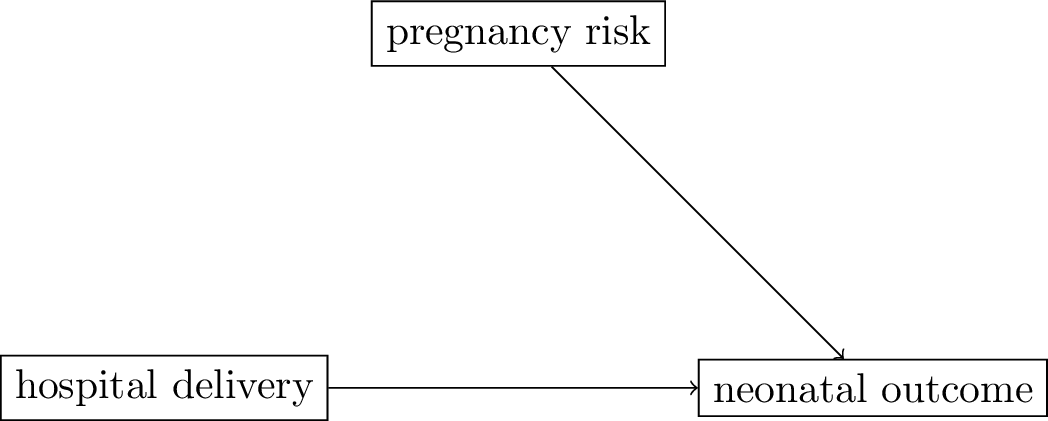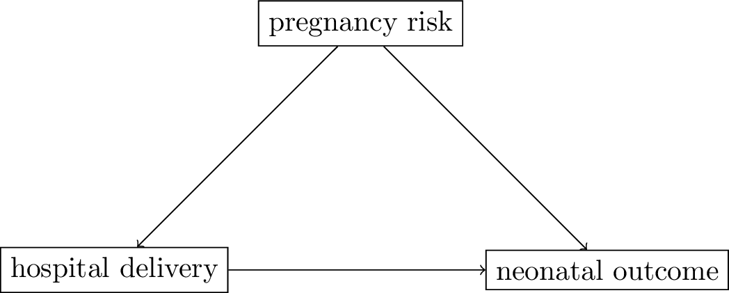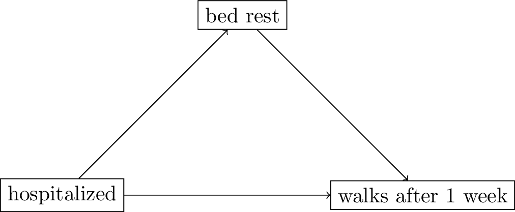 pregnancy risk) are referred to the hospital for deliverypregnancy risk and hospital delivery cause neonatal outcomepregnancy risk is a common cause of the treatment (hospital delivery) and the outcome (this is called a confounder)bed rest than those who remain at homebed rest leads to lower recovery times thus less walking patients after 1 weekbed rest is a mediator between the treatment (hospitalized) and the outcome