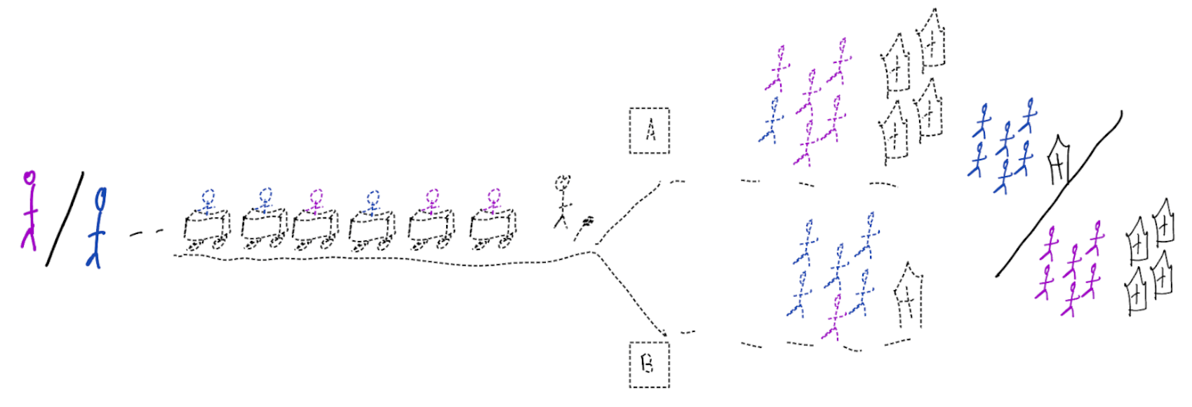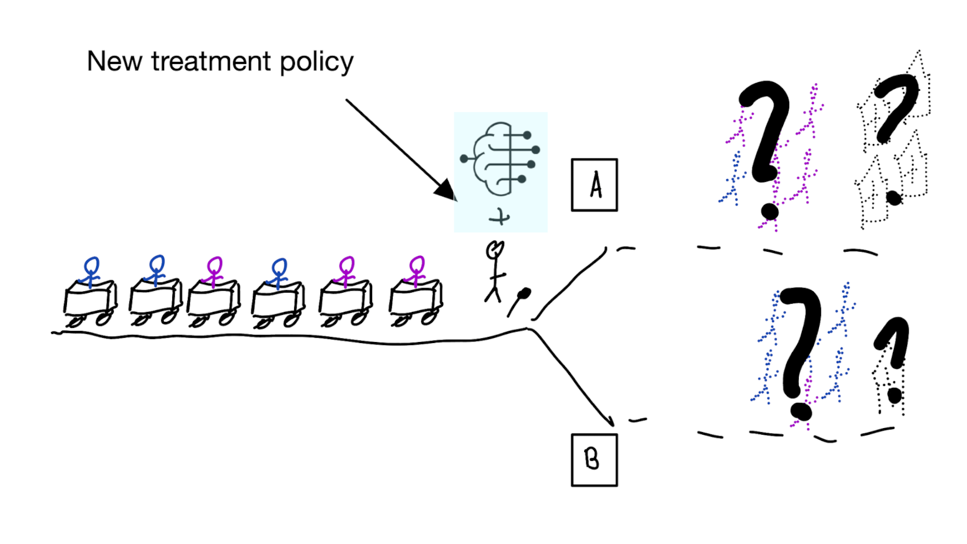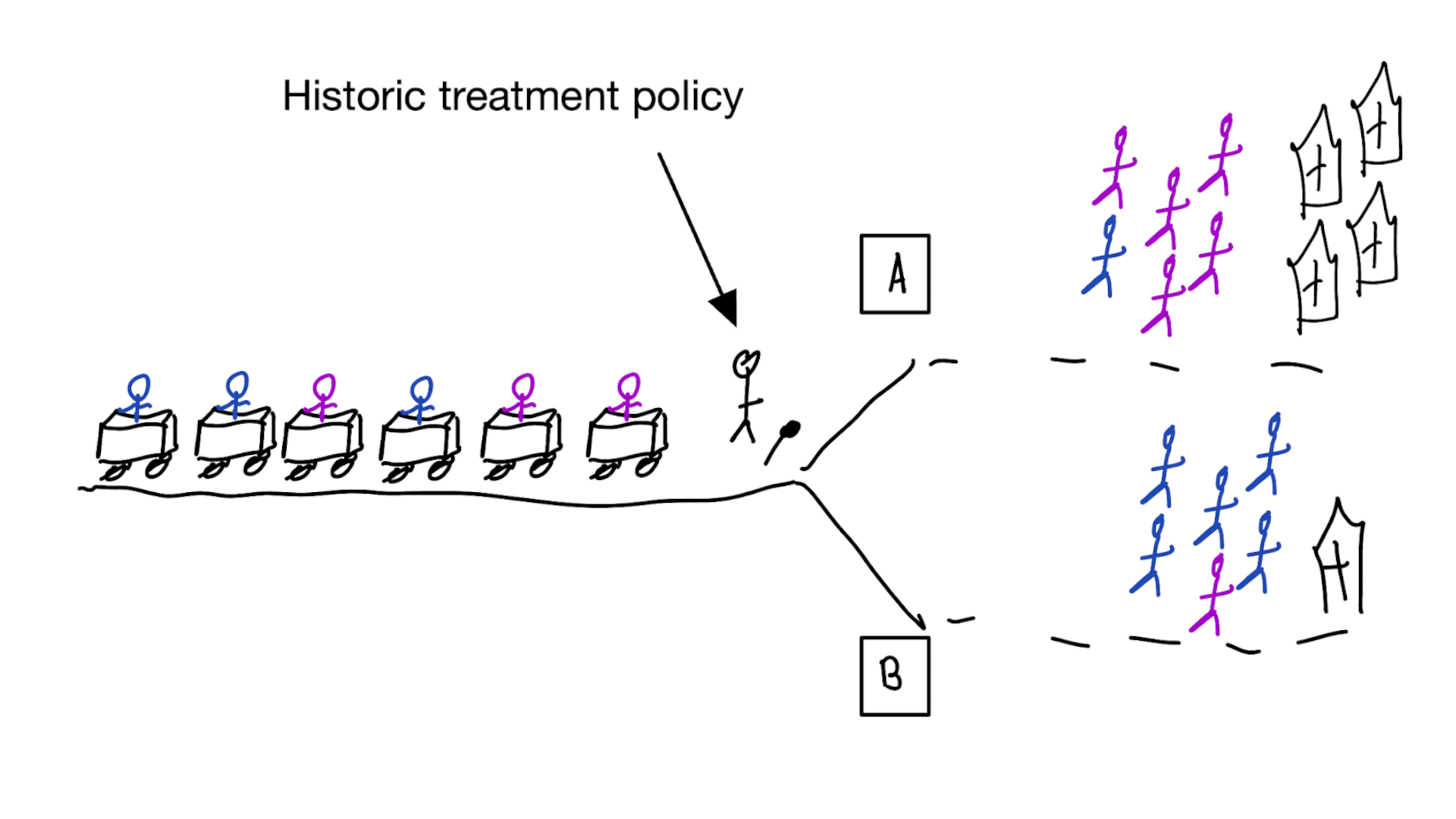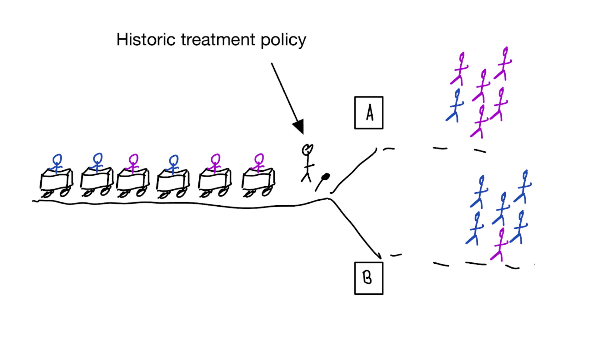 \[\begin{align} E[Y|X] \class{fragment}{= E[E_{t~\sim \pi_0(X)}[Y|X,t]]} \end{align}\]