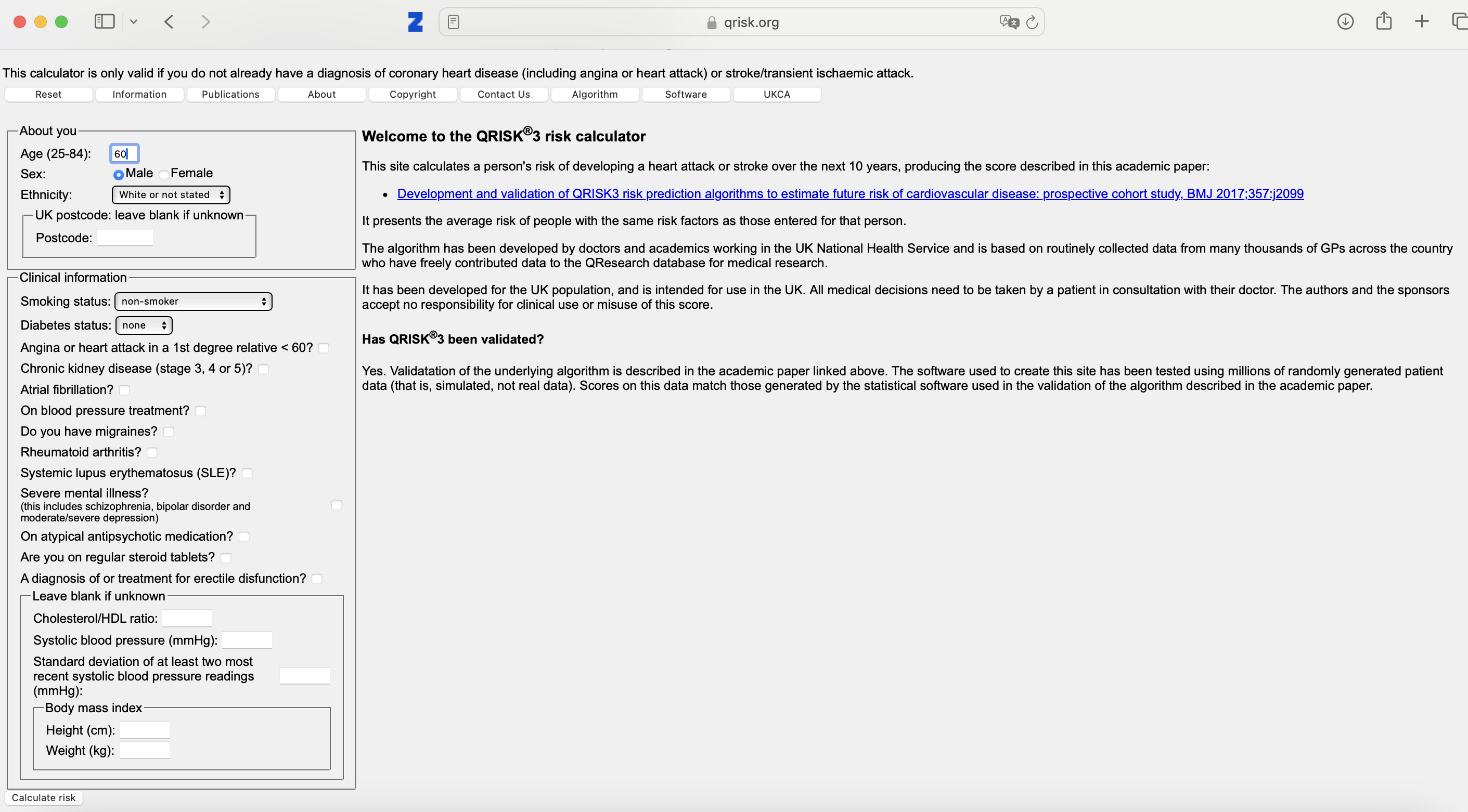 Qrisk3: a risk prediction model for cardiovascular events in the coming 10-years. Widely used in the United Kingdom for deciding which patients should get statins