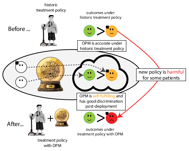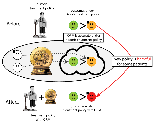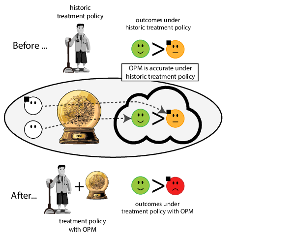 It may seem obvious that you should not ignore historical treatments in your prediction models, if you want to improve treatment decisions, but many of these models are published daily, and some guidelines even allow for implementing these models based on predictve performance only