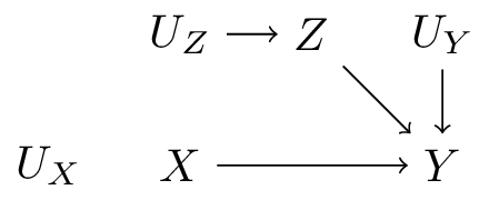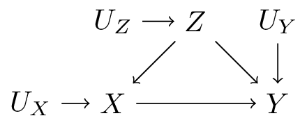 \[ F = \begin{cases} Z \leftarrow f(U_Z) \\ X \leftarrow f(Z, U_X) \\ Y \leftarrow f(X, Z, U_Y) \end{cases} \]